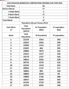 राज्याचा अधिकृत रोस्टर प्रसिद्ध होताच अंतिम आरक्षण निश्चित होईल; मात्र विद्यमान लोकसंख्या आकडे पाहता SC—2 प्रभाग ठरतील, तर ST—0 (किंवा रोस्टरनुसार 1) अशी प्राथमिक शक्यता स्पष्ट दिसते.